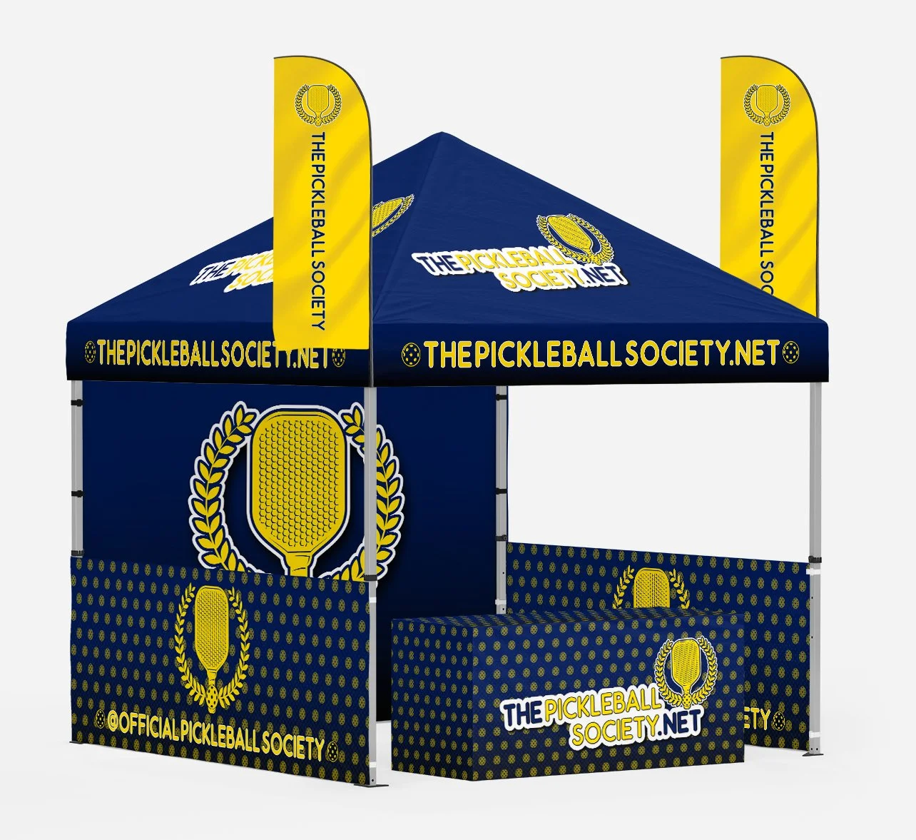 Brand: Pickleball Society Product: Pop-up event tent with feather flags. Note: The main “paddle with wreath” logo was provided by client