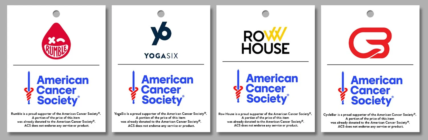 Brand: All Xponential Fitness Brands Product: Product hang tags with transparent plastic top, and in collaboration with American Cancer Society
